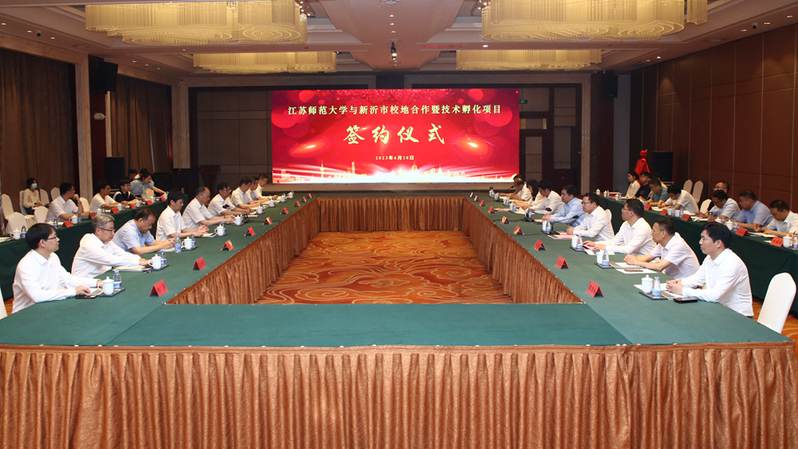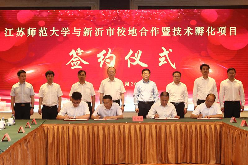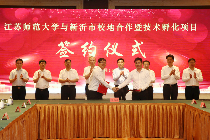 6月20日下午,江苏师范大学与新沂市校地合作暨技术孵化项目签约仪式在新沂市戴斯酒店举行。江苏师范大学党委书记方忠,副校长杜增吉、董晓臣,新沂市委书记陈堂清,市长李胜出席活动。校地双方相关领导和各有关部门主要负责同志,以及企业界代表参加活动。校地双方相关领导和各有关部门主要负责同志,以及企业界代表江苏华信新材股份有限公司副总经理张道远,新沂市诚洲环保科技有限公司总经理张新杰,江苏汉德森新材料科技有限公司执行董事周荣柏参加活动。