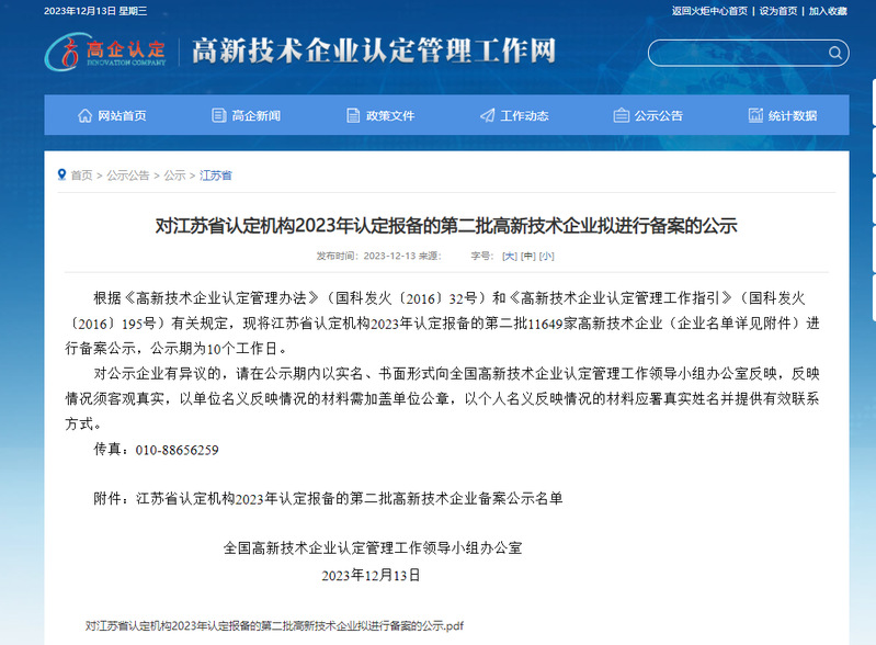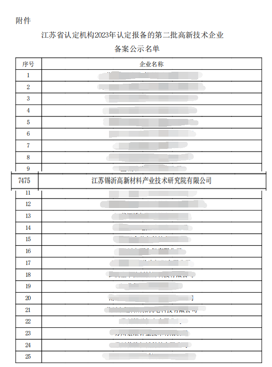 近日,全国高新技术企业认定管理工作领导小组办公室根据《高新技术企业认定管理办法》和《高新技术企业认定管理工作指引》有关规定,公示了江苏省认定机构2023年认定报备的第二批高新技术企业名单,江苏锡沂高新材料产业技术研究院通过认定,被授予“国家高新技术企业”称号。