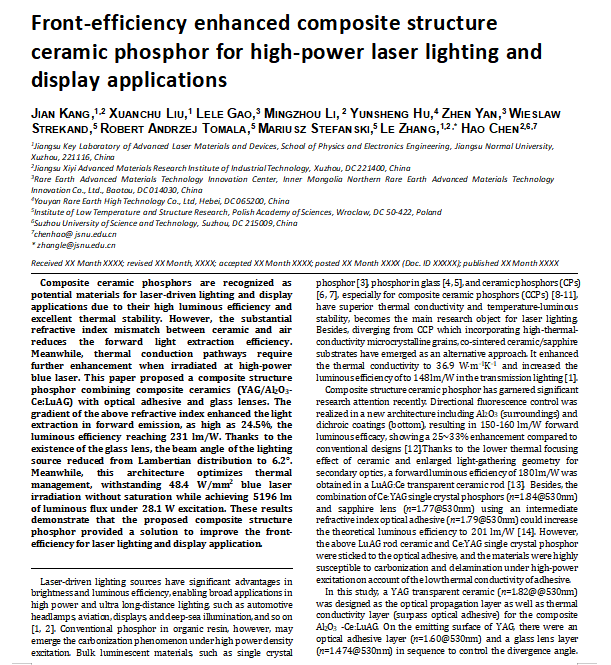 近日,我院光功能材料事业部康健主任及其小组成员,在高功率激光照明与显示用荧光陶瓷材料研究中取得重要进展。相关研究成果以《Front-efficiency enhanced composite structure ceramic phosphor for high-power laser lighting and display applications》为题,发表于国际光学权威期刊《Optics Letters》。